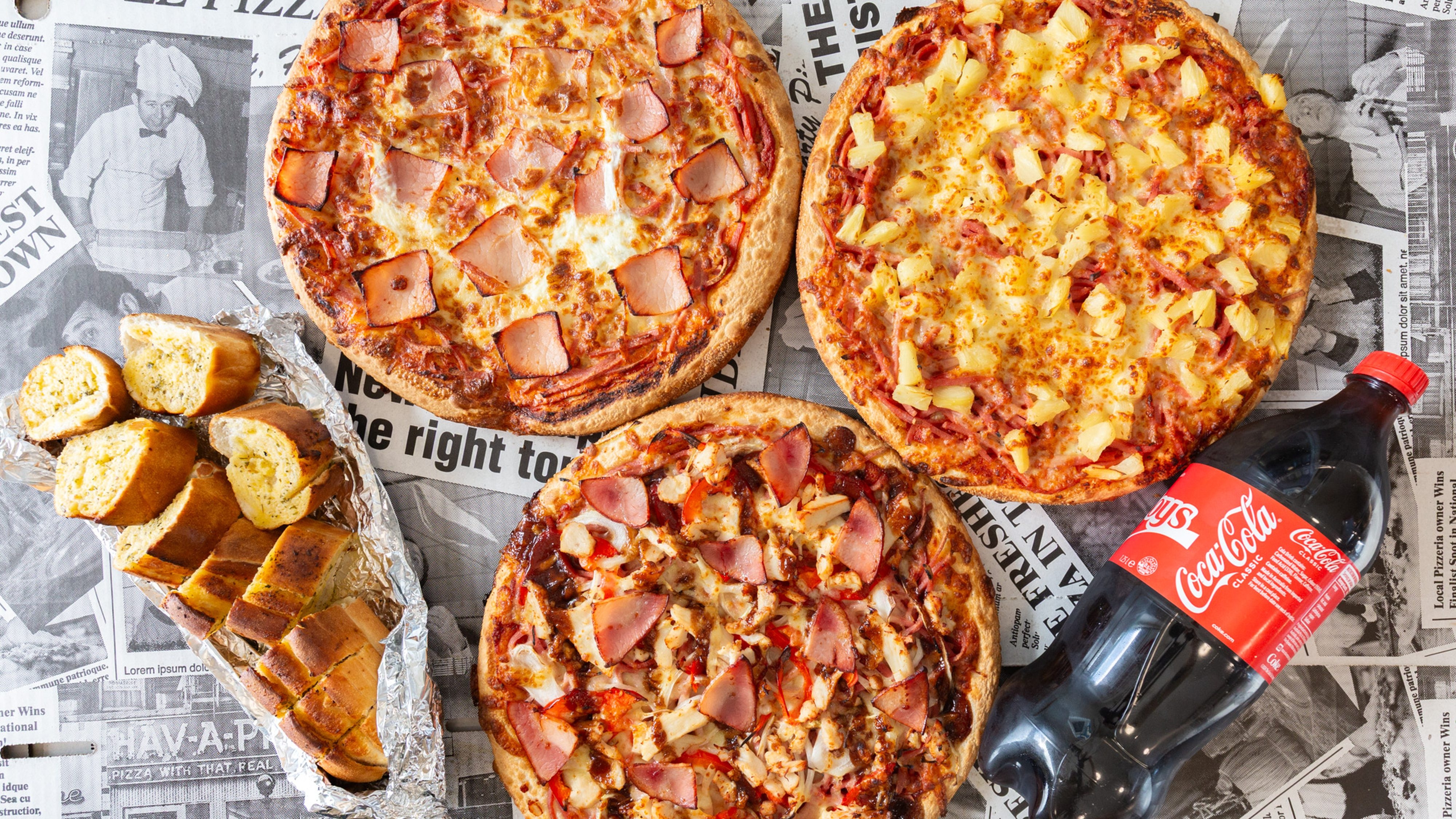 3 large pizzas, 11 inch garlic bread, and 1.25L drink