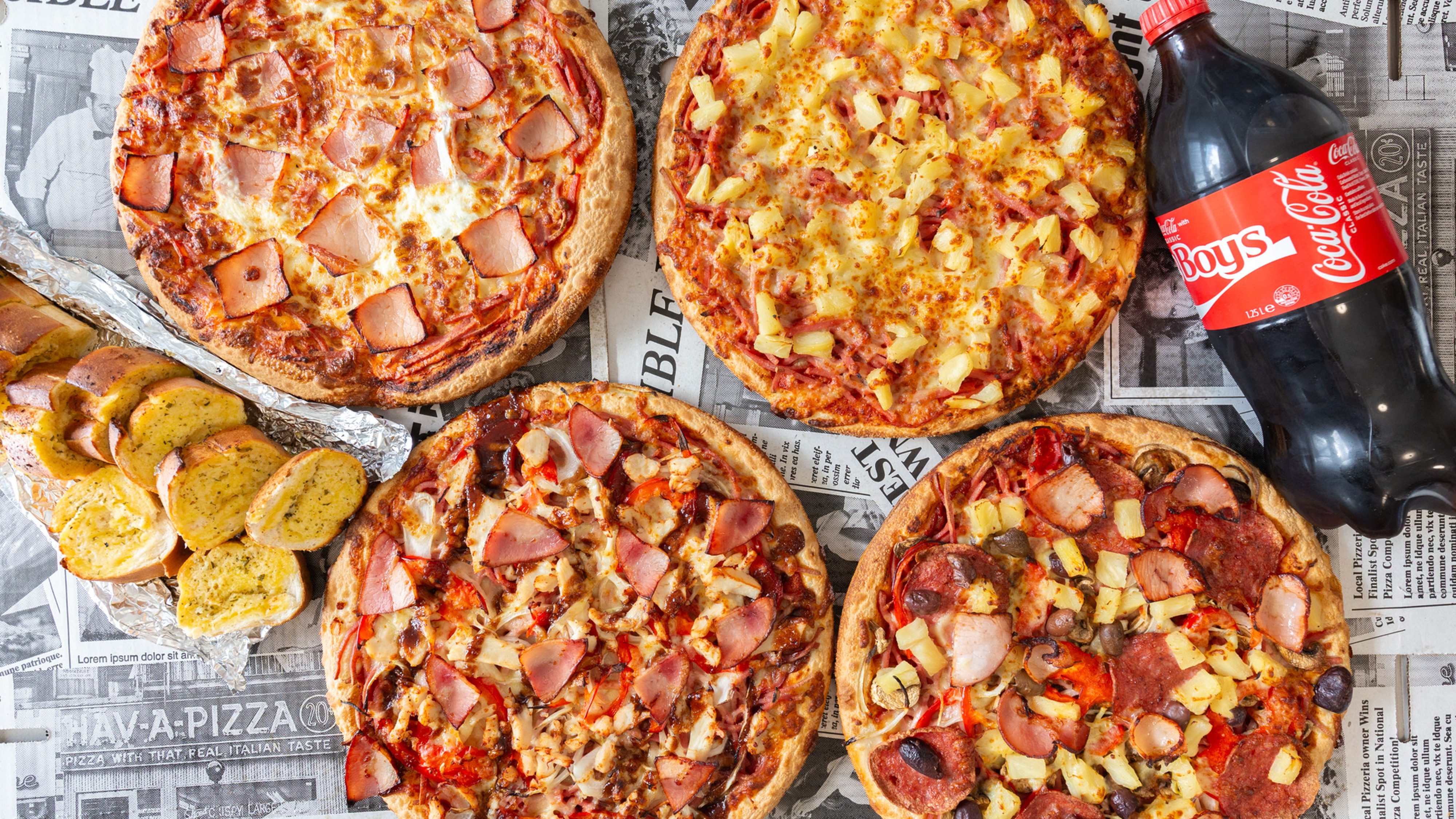 4 large pizzas, 11 inch garlic bread, and 2x 1.25L drinks.
