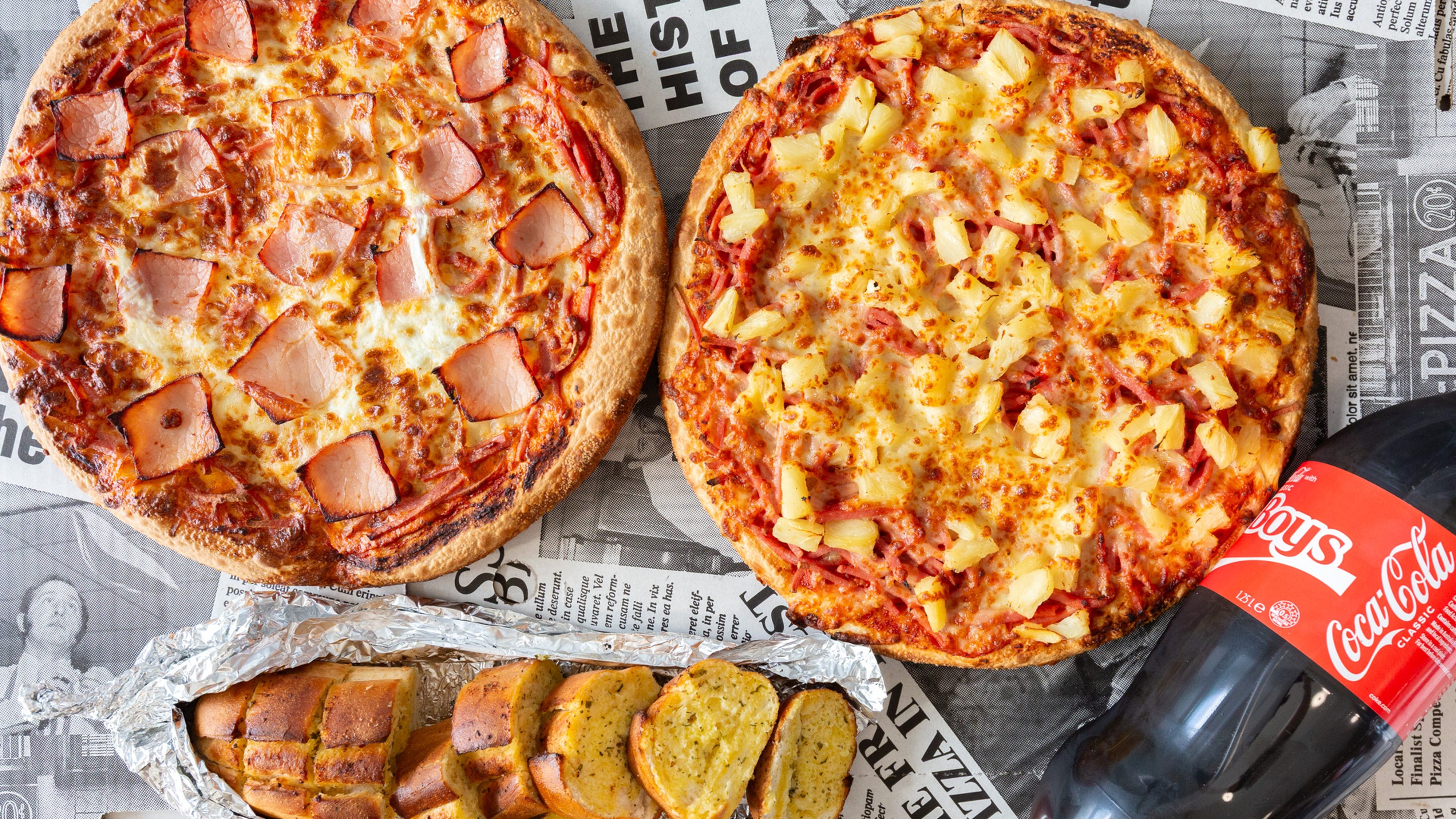 2 large pizzas, 11 inch garlic bread, and 1.25L drink.