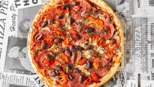 Ham, mushroom, salami, capsicum, olives, garlic, anchovies and oregano.
