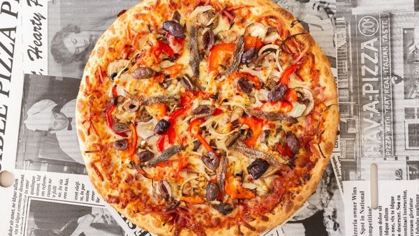 Ham, Mushroom, Fresh Red Capsicum, Onion, Olives, Anchovies, Mozzarella, Tomato Base.